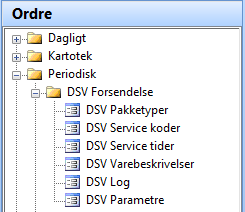 DSV Forsendelse Under Ordre/Periodisk eller Projekt/Periodisk ligger menupunkt til DSV støtte kartotekerne