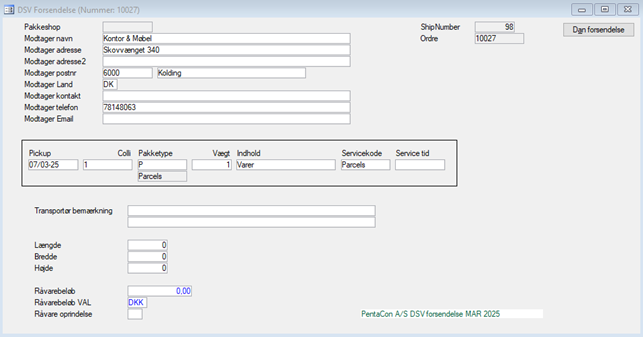 Klik på Dan forsendelse for at sende forsendelsesdata til DVS med efterfølgende udskrift af pakkelabel.