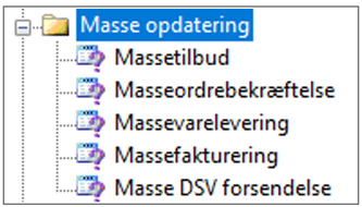 Det er desuden muligt at danne fragtbreve for et udvalg af ordrer/projekter som ved massefakturering. Under Ordre eller Projekt/Periodisk/Masseopdatering ligger menupunktet til Masse DSV forsendelse. Ved aktivering skal der afgrænses på de ordrer/projekter, der ønskes dannet fragtbreve til.